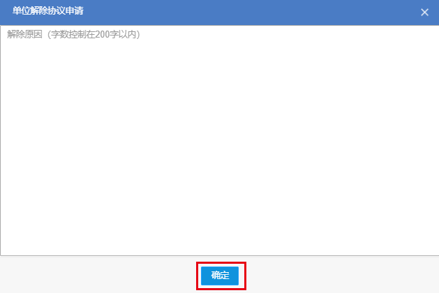 2.在弹出的对话框中填写解约原因,并点击“确定”申请解约。学生同意且学校审核通过后即完成解约。用人单位可在“单位签约中心”查看当前解约状态和学校审核状态。如学生需要解约函/离职证明等材料,用人单位可在线下提供给学生。